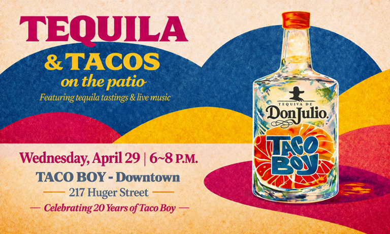 A midweek excuse, well spent—Tequila & Tacos on the Patio at Taco Boy celebrates Taco Boy’s 20th anniversary on Wednesday, April 29, with tequila tastings, lively taco stations, music, thoughtful giveaways, and more.